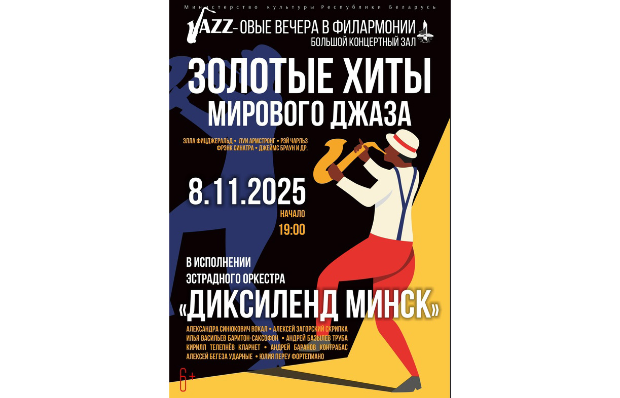 Белгосфилармония приглашает всех любителей джаза провести субботний вечер 8 ноября в компании столичного джаз-бенда «Диксиленд Минск». В репертуаре проекта — музыка Луи Армстронга, Фрэнка Синатры, Элвиса Пресли, Джеймса Брауна, Рэя Чарльза, Мерлин Монро, а также самые известные и популярные шлягеры в современной аранжировке.